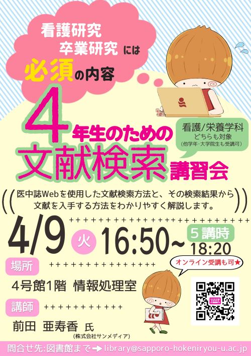 看護学科・栄養学科4年次及び大学院生を対象に「文献検索講習会」をオンライン開催いたします。