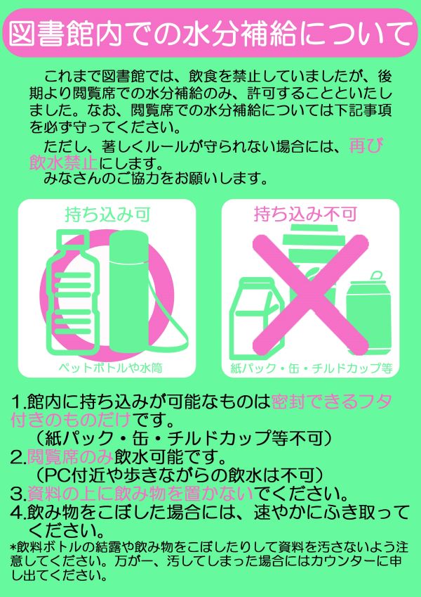 これまで図書館では、飲食を禁止していましたが、後期より閲覧席での水分補給のみ、許可することといたしました。