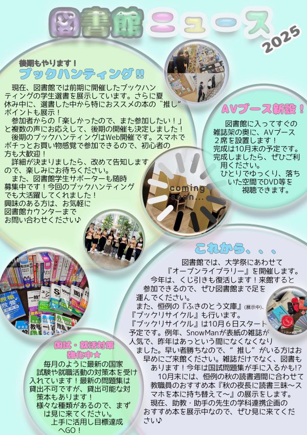 また、図書館ニュースで前期の活動とこれからのイベント等をお知らせしています。