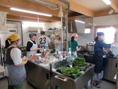 6月15日(土)に札幌市東区東雁来地区にある「きらりの」で、「地域食堂」(豊生会グループのNPO法人ニルスの会主催)が開かれ、栄養学科の1年生と3年生の計5名が、地域の方を手作り料理でもてなしました。