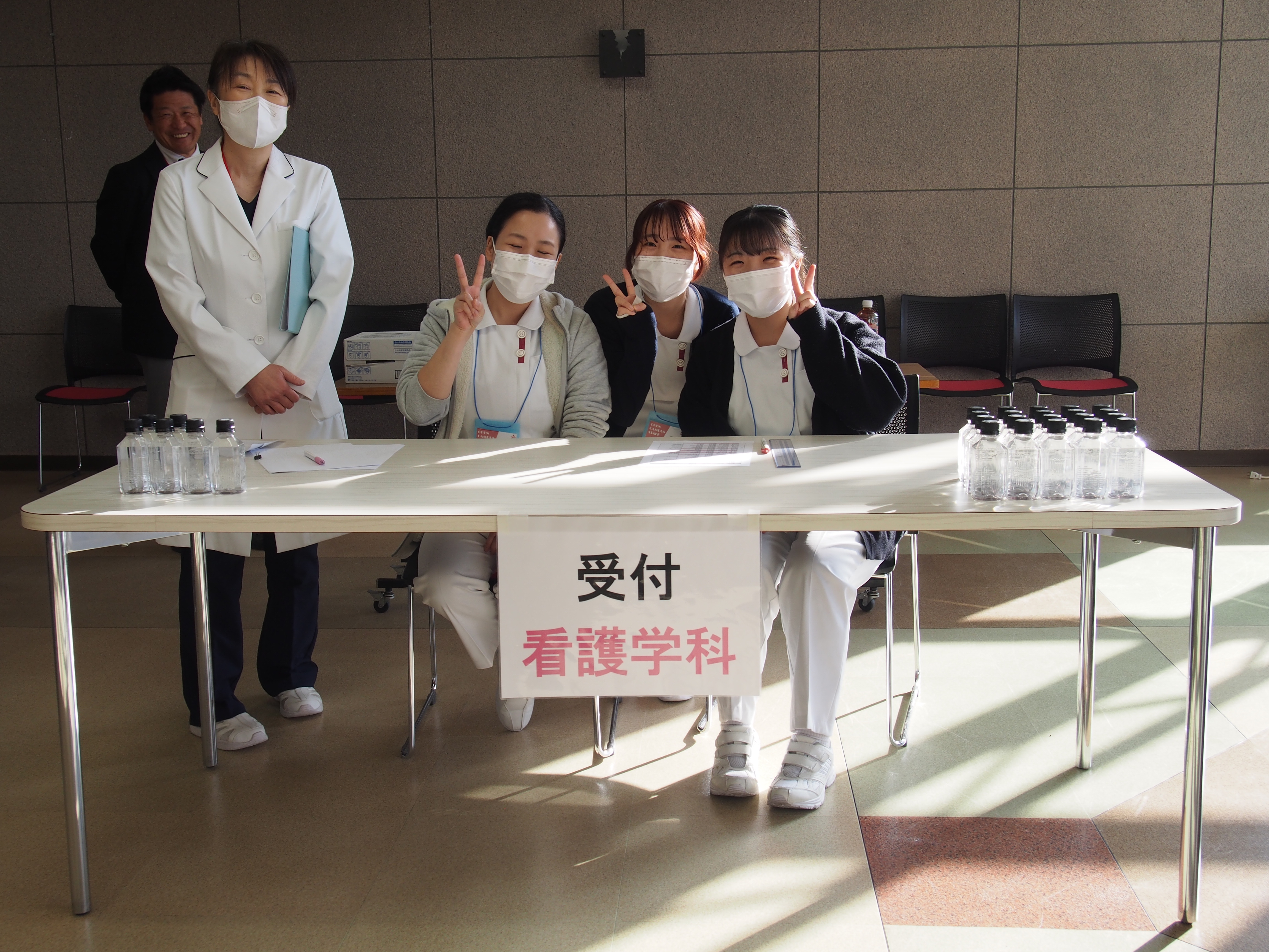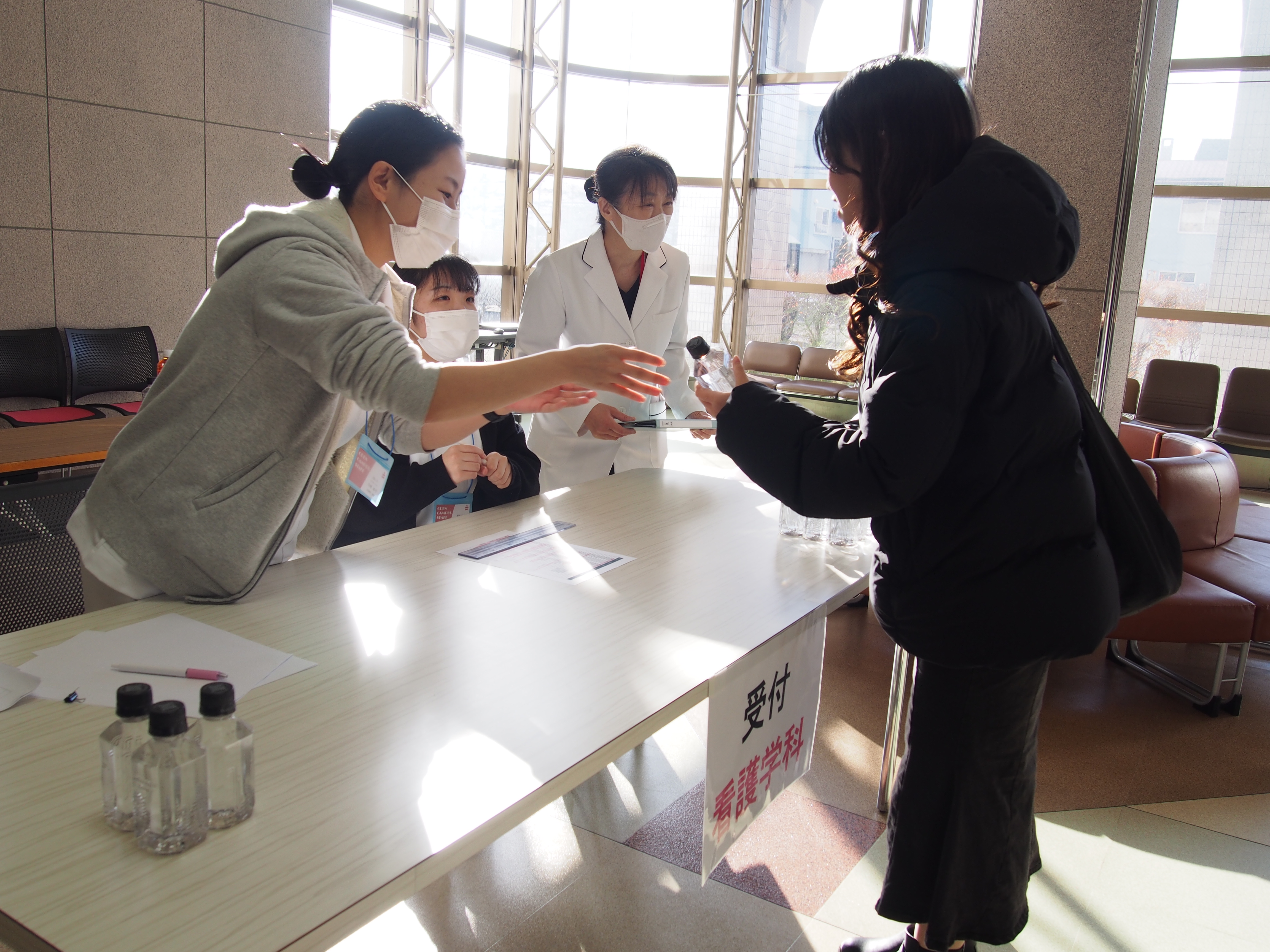 看護学科では、実習室や各教室、ラウンジ等施設を見回る大学見学ツアーや研究室訪問などのほか、演習体験を行いました。