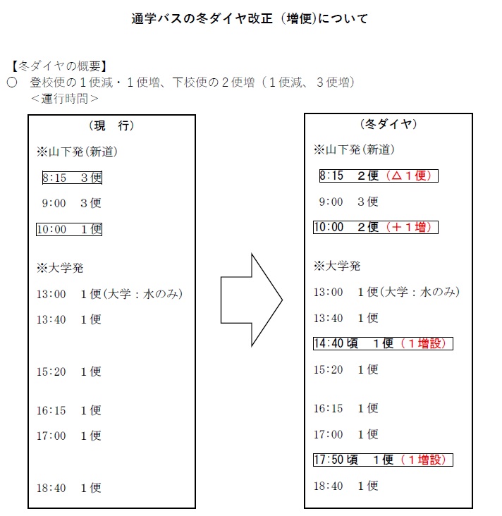 中央バス㈱の12月1日付けダイヤ改正に伴い、本学の通学バスの運行便を増便しました。