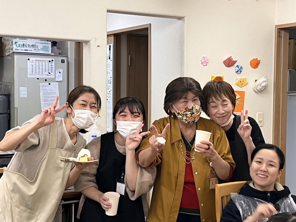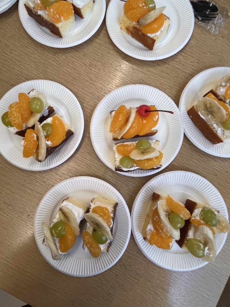 今回は12月ということでフルーツケーキならぬフルーツカステラケーキを利用者さん方と作って来ました!利用者さんと学生が一緒になって、フルーツをカットしたり、クリームを乗せたり、飾り付けをしたりして、世界に一つだけのケーキがたくさん作ることができました!