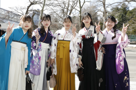 3月15日(日)、看護学科10期生、栄養学科6期生、そして大学院の修了生の卒業証書・学位記授与式が、かでる2・7(かでるホール)にて執り行われました。卒業生151名に向け、大日向輝美学長からの式辞、学校法人吉田学園 吉田祐樹理事長、大学同窓会会長 田中亜夢様からの祝辞に続き、在学生代表の栄養学科 幸池 夏旺さんが送辞を、卒業生を代表して栄養学科の権代琴美さんが謝辞と社会人としての決意を述べ、式は終了しました。来賓、保護者の皆さまから祝福を受けるなか、友人や恩師との別れを惜しみながらも、卒業生はそれぞれの道に新たな一歩を踏み出しました。式終了後は卒業祝賀会にて、卒業生と教職員がともに楽しいひと時を過ごしました。